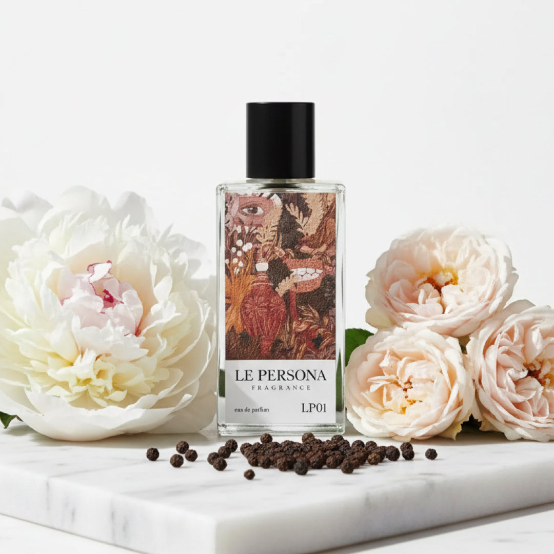 A captivating rose-infused fragrance that unveils your most charming side. Luminous white peony and centifolia rose bloom with a hint of black pepper, leading into a warm heart of jasmine, amber, and vanilla tea. The scent settles into sensual cedarwood, musk, incense, and patchouli, creating an elegant and lasting trail that feels romantic, mysterious, and irresistible.